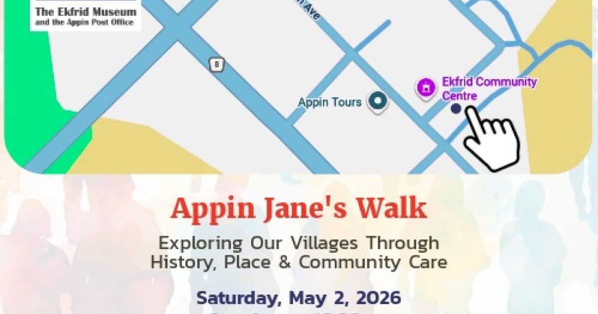 Event poster for “Appin Jane’s Walk” featuring a map highlighting Ekfrid Museum and the Ekfrid Community Centre, with event details including Saturday, May 2, 2026 at 10:30 AM and the starting point at Ekfrid Museum and Post Office in Appin, Ontario.