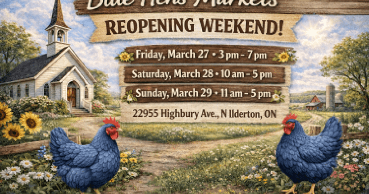 Promotional banner for Blue Hens Markets Reopening Weekend featuring a rustic countryside illustration with a small white church, farm landscape, and two blue hens in the foreground, along with event dates, times, and location details in North Ilderton, Ontario.