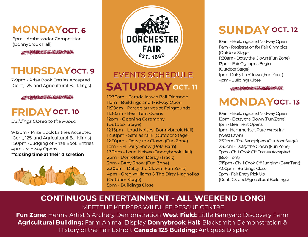 The fair kicks off in style on Saturday, October 11. At 10:30 am the parade departs the Dorchester Arena and makes its way along Hamilton Road to the fairgrounds. Then join us for the opening ceremony outdoors, with a full day of entertainment ahead.Lots of Competitions & Displays