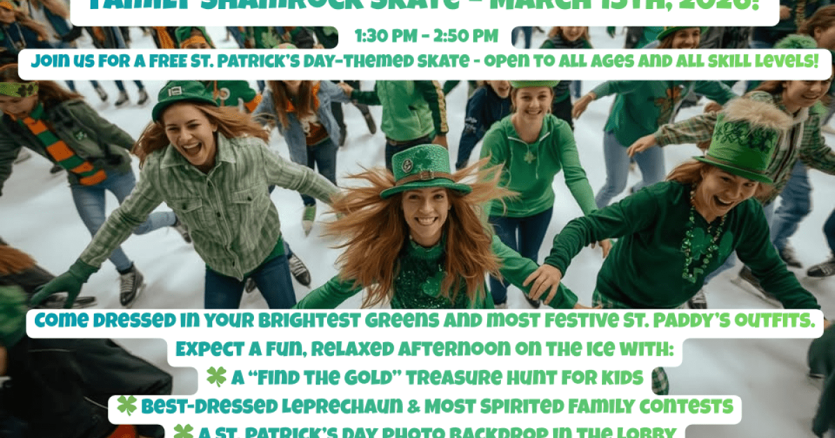 Join us for a FREE St. Patrick’s Day themed family skate, open to all ages and all skill levels!