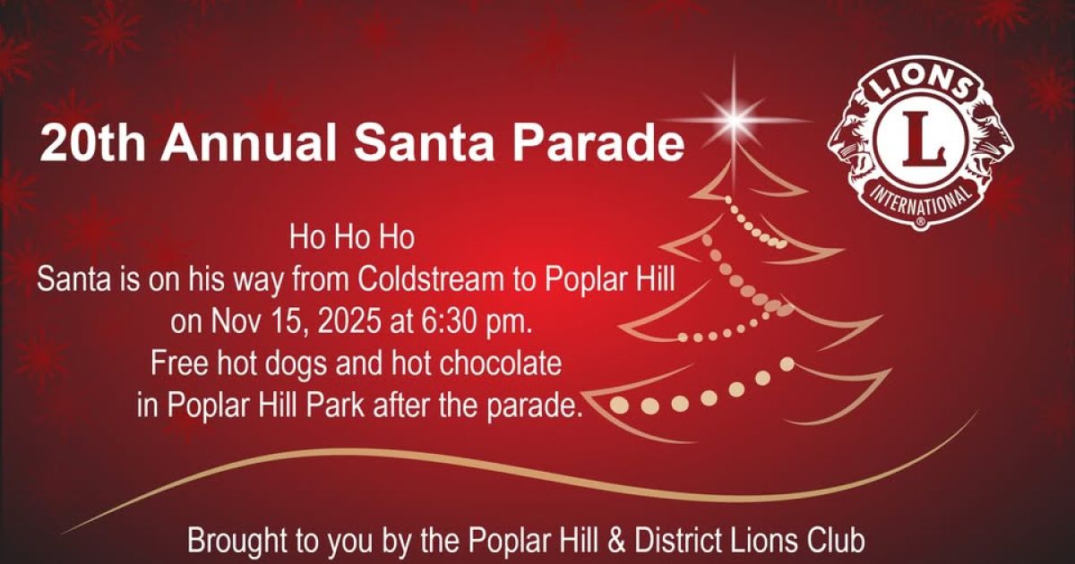 - The parade will be leaving Coldstream for Poplar Hill Park at 6:30pm. Free hot dogs and hot chocolate at Poplar Hill Park after the parade.