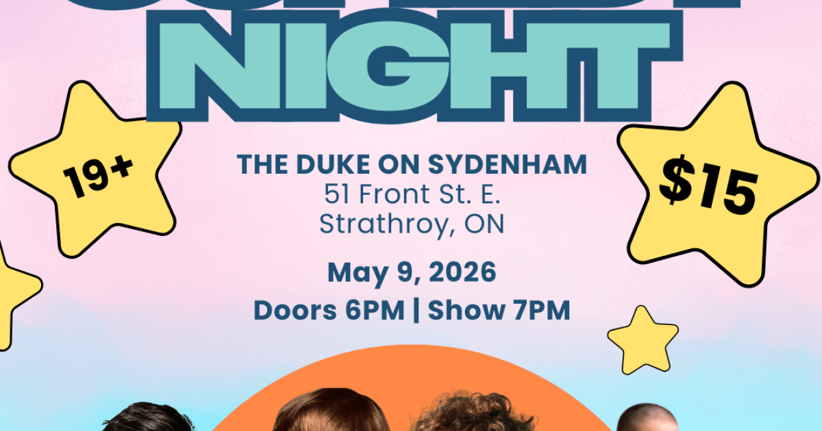 Colorful poster for “Queer Comedy Night” featuring bold pastel text and star graphics. Event details include The Duke on Sydenham in Strathroy, Ontario, on May 9, 2026, with doors at 6 PM and show at 7 PM. The poster notes 19+ admission and $15 tickets, and features photos of four comedians along the bottom.